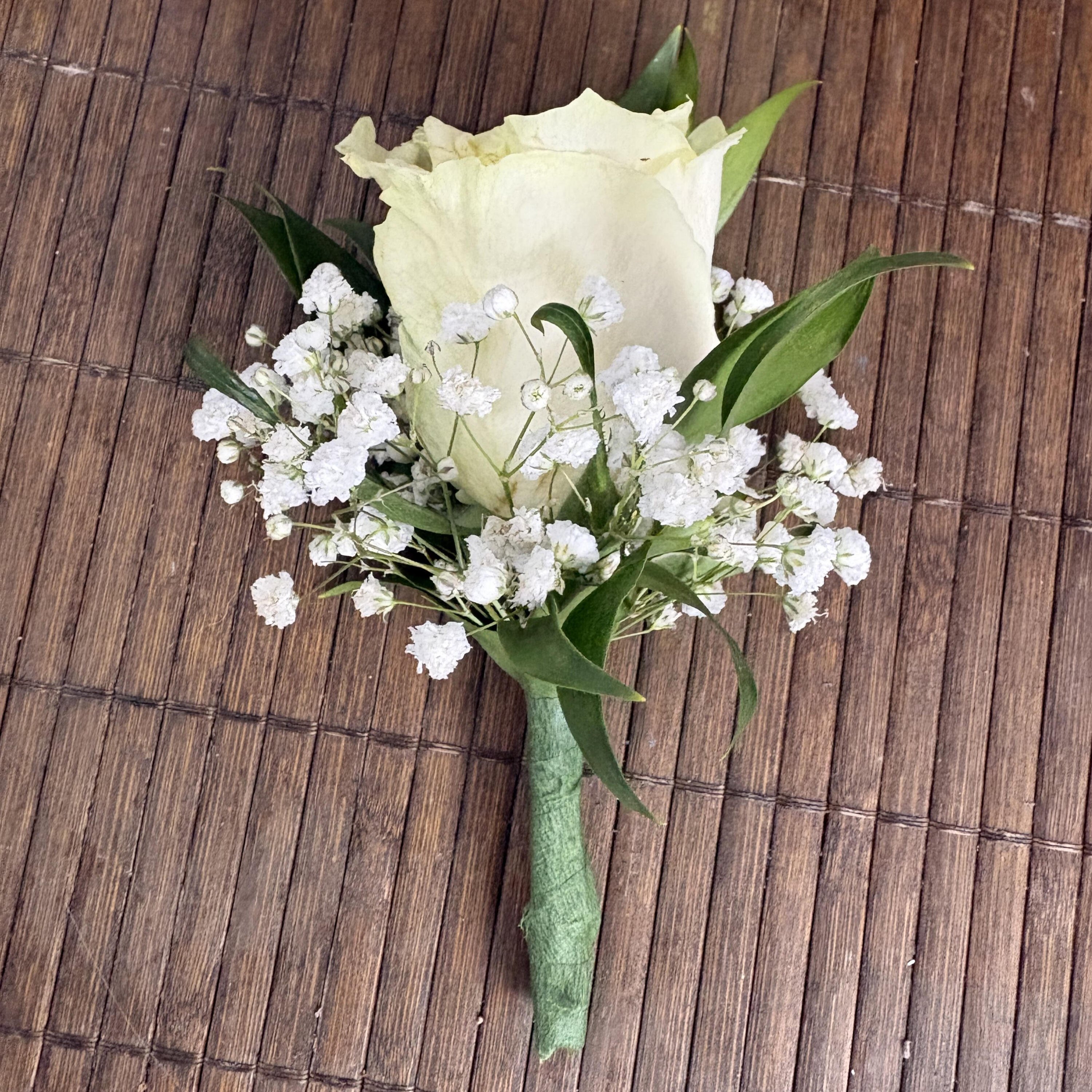 Small, elegant floral arrangements worn on the lapel, typically featuring a single bloom or a simple cluster of flowers accented with greenery.